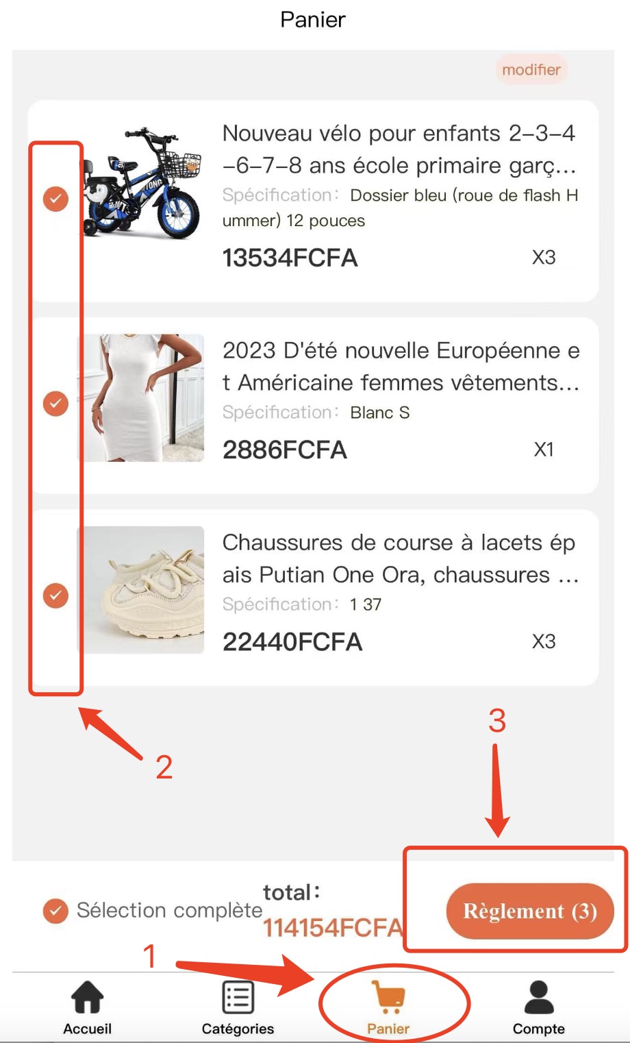 Étape 2 : Confirmez la commande et vérifiez si le montant total est supérieur à 50 000 FCFA. Si le montant est inférieur, le paiement ne pourra pas être effectué.